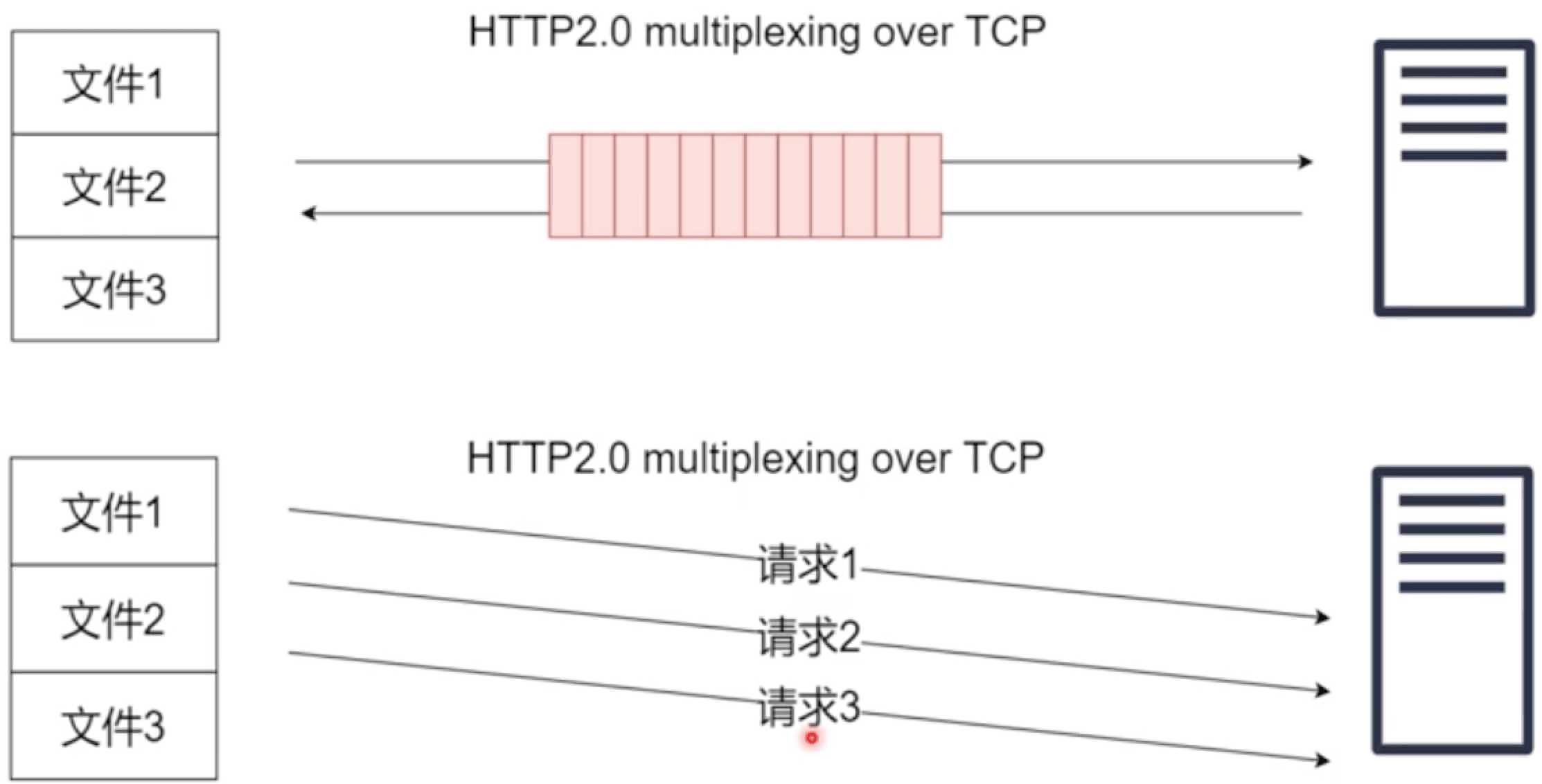 http1.1是一个请求过去,一个请求返回来,然后在进行下一个请求;其实是在排队的。http2.0发现2个请求比较靠近,把2个请求打包成一个请求发过去;也就是说把几个请求打包成一个小块去请求,并行发送;即使一个阻塞了,另一个还能回来,可以并行的出去也可以并行的回来;假如第一个请求需要0.8秒,第二个第三个各需要0.5秒;那么http2.0可以在0.8秒内把这3个一起去请求,这样只需0.8秒,即使一个阻塞了也不影响其他的返回。